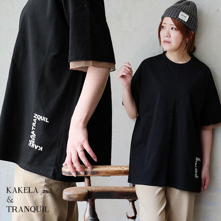 ちょっとした袖のアソビ。いつも通り着られる安心感。 Tシャツ 5分袖 レディース クルーネック 袖 メッシュ 切り替え 綿100 コットン 天竺 伸縮性 通気性 ロゴ刺繍 ワンポイント 大きいサイズ 体型カバー 着痩せ すっきり カジュアル 夏 パティ KAKELA&TRANQUIL カケラ&トランクイル