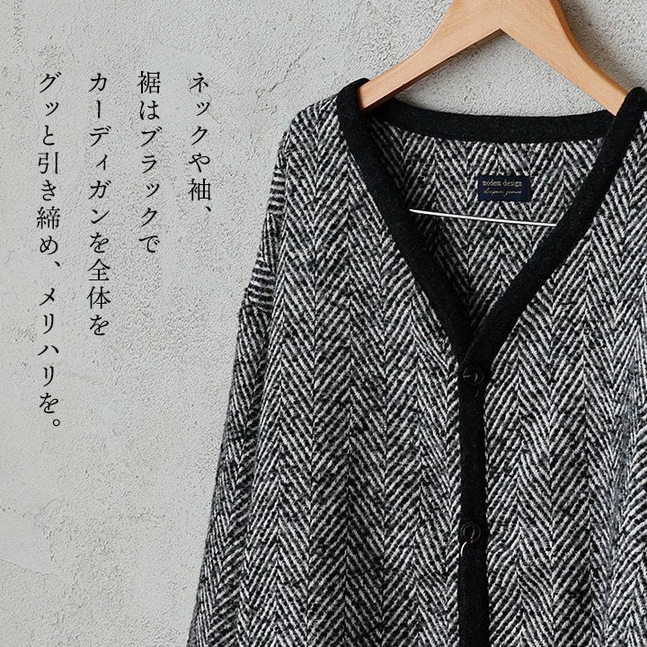 大人好みのシックな「ヘリンボーン」。 カーディガン 長袖 メンズ レディース Vネック 重ね着 ヘリンボーン モノクロ ポリエステル ウール 軽い 暖かい ゆったり カジュアル レトロ ヴィンテージ 秋 冬 パティ modem Design モデムデザイン