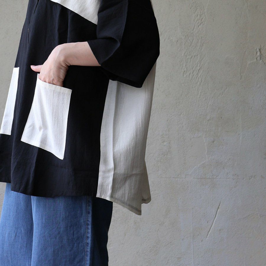 3. 【アウトレット】 【B品傷あり】シャツ 5分袖 レディース 配色切り替え モノクロ ポケット 無地 レーヨン 薄手 涼しい 軽い 通気性 ゆったり 体型カバー 大きいサイズ 大人カジュアル 春 夏 パティ sandy サンディー