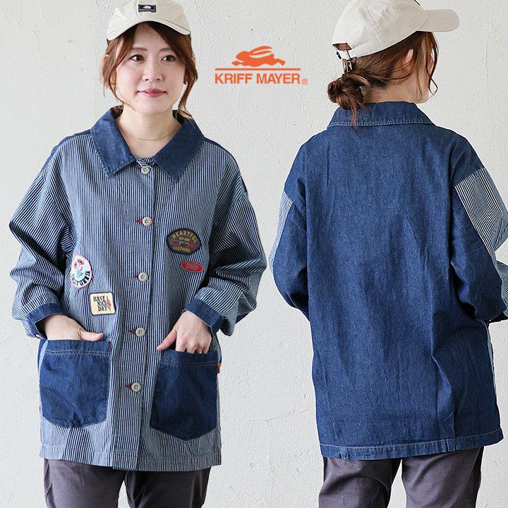 3. 【アウトレット】(A品) レディース カバーオール ロゴ ワッペン 綿100 コットン ヒッコリー 配色切り替え インディゴ 大きいサイズ カジュアル パティ KRIFF MAYER クリフメイヤー