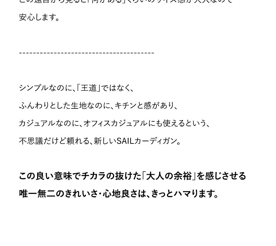 【客観的コメント】大き過ぎる感じはなかったし、中に、いろいろ合わせて着たいなら、選んでも問題のないサイジングだね。