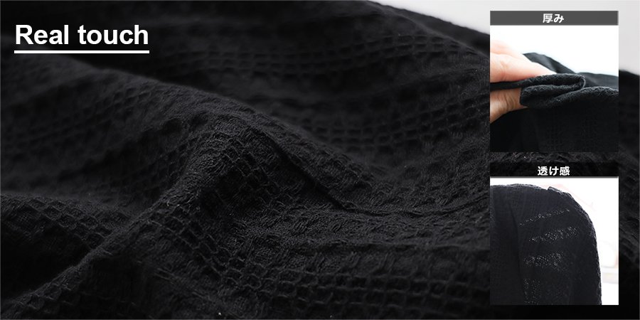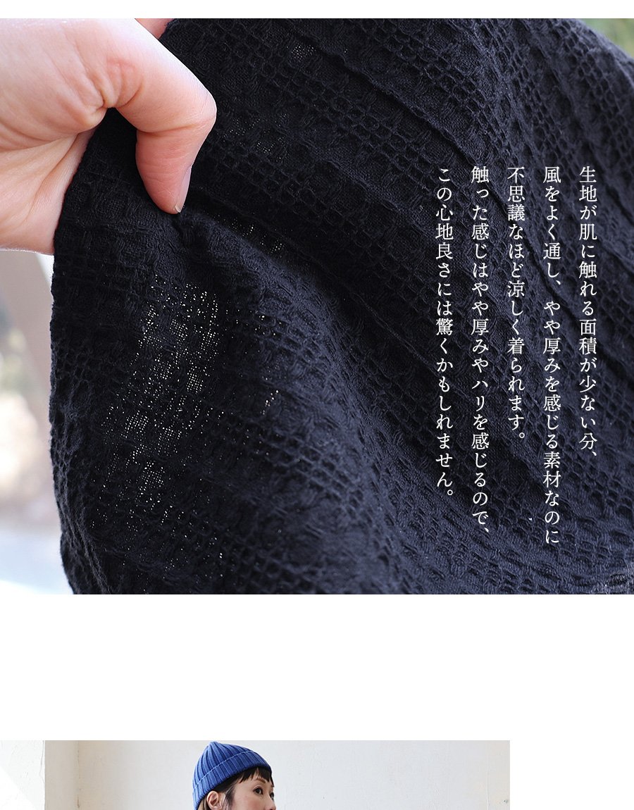 程よく厚みのあるワッフル調のドビー織り生地。少しザラっと感のある凹凸の触り心地が特徴的。伸縮性はなく、光にかざすと織りによる透け感が若干あります。