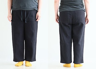 【モデルコメント】骨盤で穿きました。ウエストゴムは適度なフィット感です。それ以外は、程好くゆとりがありました。 【客観的コメント】まもるくらいの体型で、丁度良い感じのサイジングだったね。