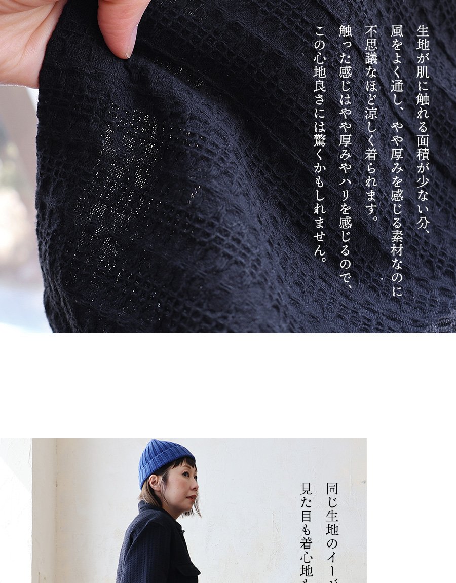 程よく厚みのあるワッフル調のドビー織り生地。少しザラっと感のある凹凸の触り心地が特徴的。伸縮性はなく、光にかざすと織りによる透け感が若干あります。