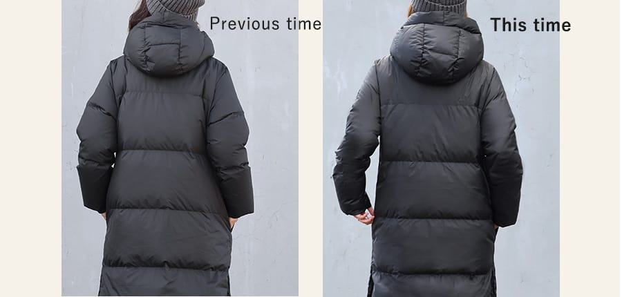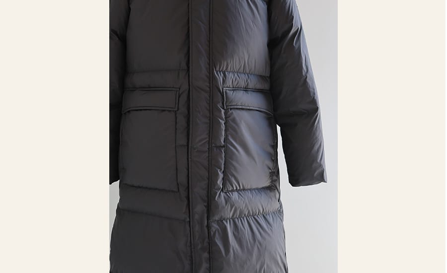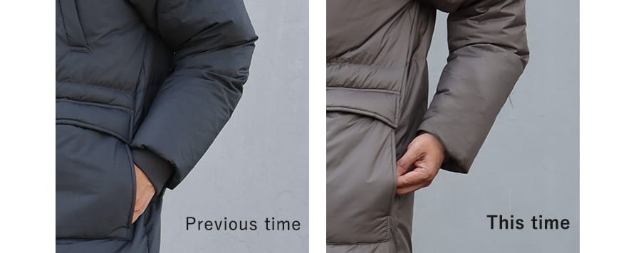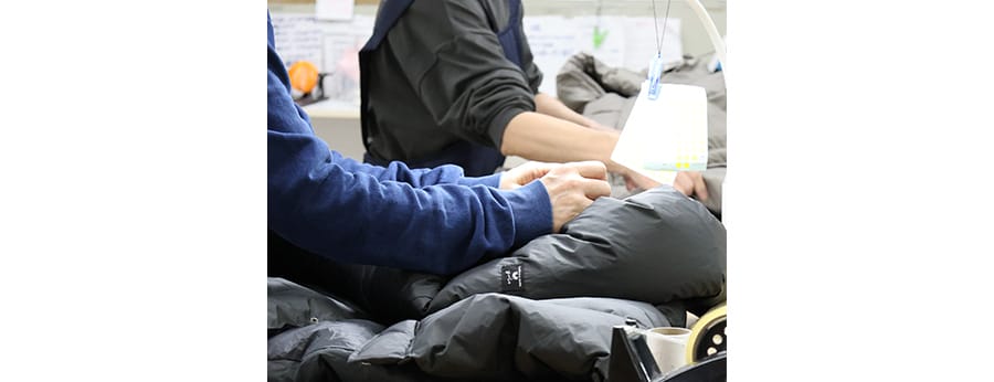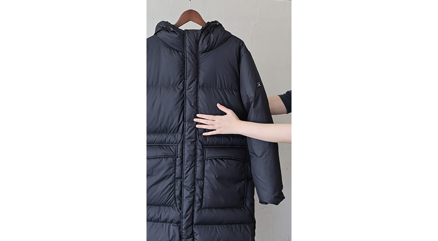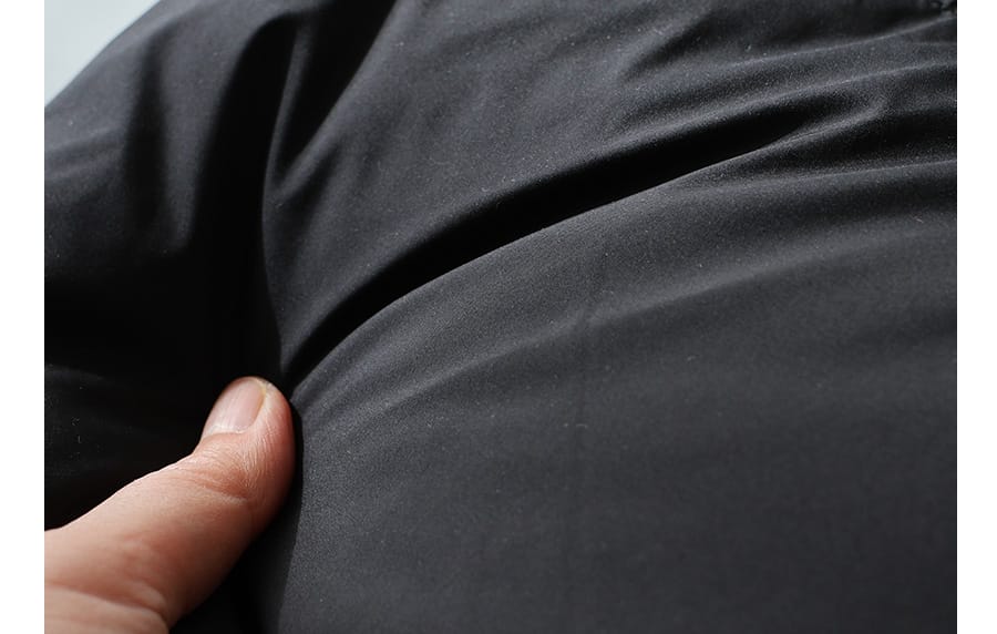 そのダウンパックを突き破って羽毛が飛び出てくることが多いので、そもそものダウンパック地の気密性を高めることで、羽毛の飛び抜けを防ぎました。
