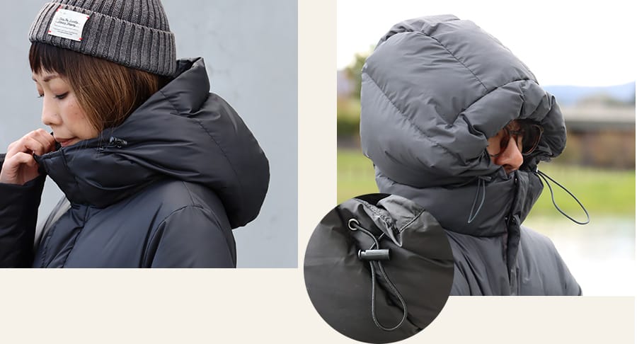 ・防風しながら小顔効果まで発揮する 「ボリュームハイネックフード」。