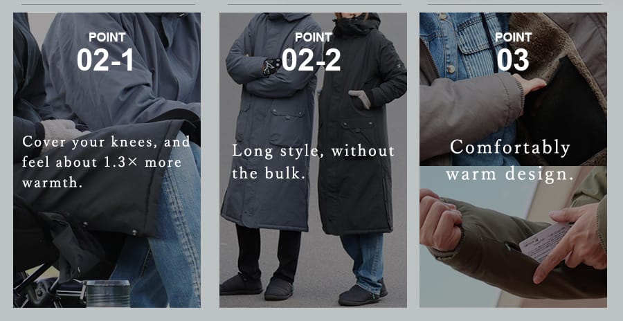 ・跳ね上がりのないフラットな裾ラインで膝までしっかり隠れる、ロング丈のベンチコート。