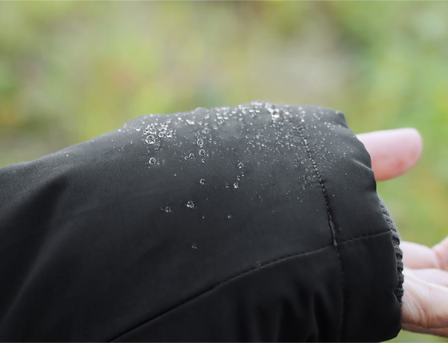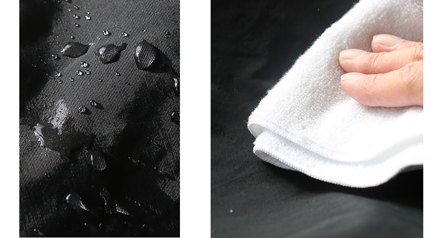 目をきっちりと詰めて織られた生地なので、防風効果が高く、フライパン等に用いられるテフロン加工をしているので、撥水性と防汚性をさらに強化。