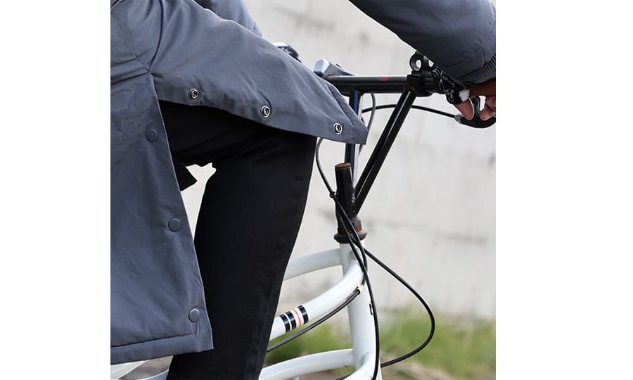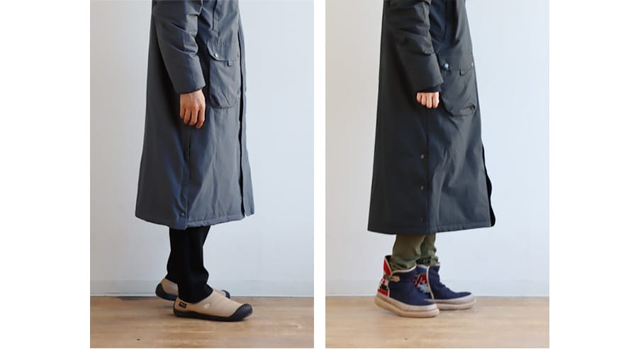 膝までしっかり隠れるロング丈だと、ジップの開け閉めのひと苦労。