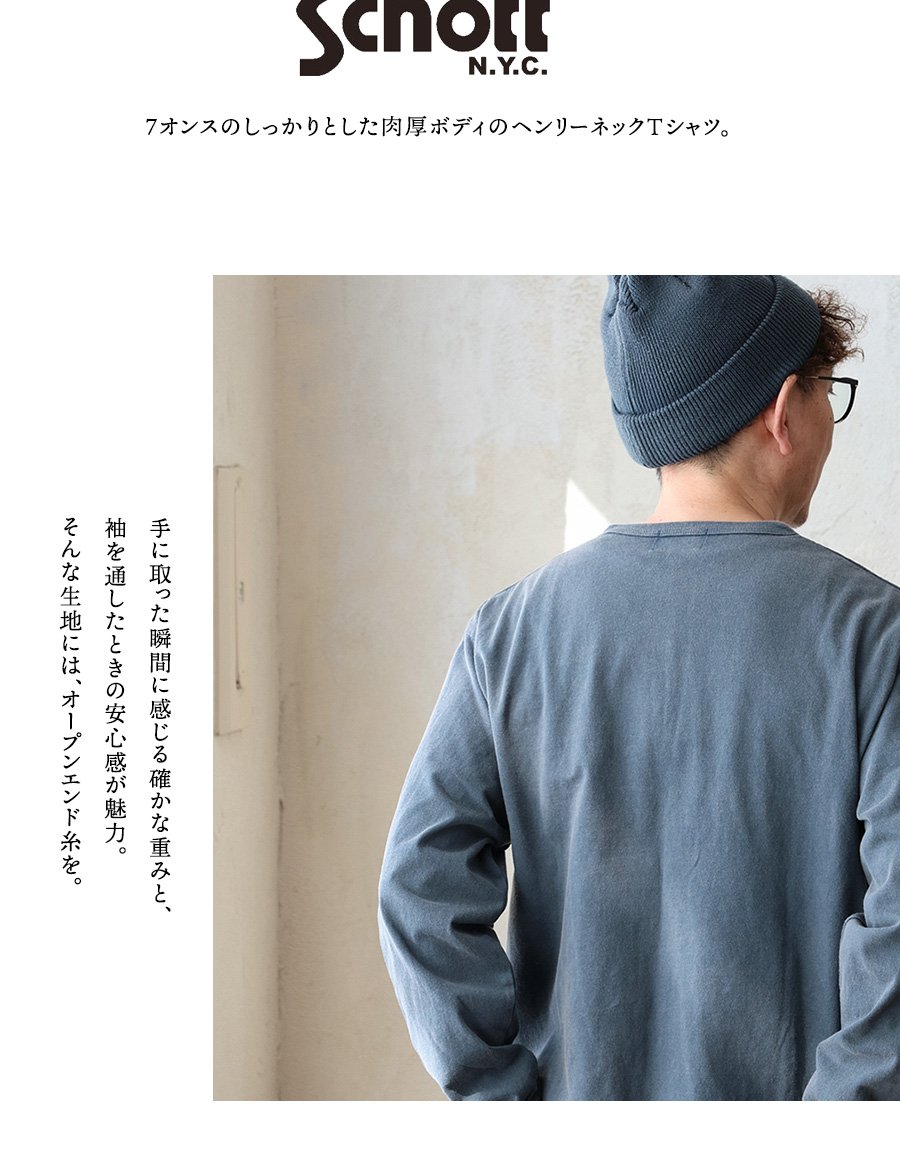 「着ることで育っていく」楽しみを味わうなら。 SCHOTT ショット カットソー 長袖 メンズ レディース ヘンリーネック 無地 ワンポイント ピスネーム 綿100 コットン オープンエンド ピグメント 褪せ色 しっかり生地 カジュアル パティ