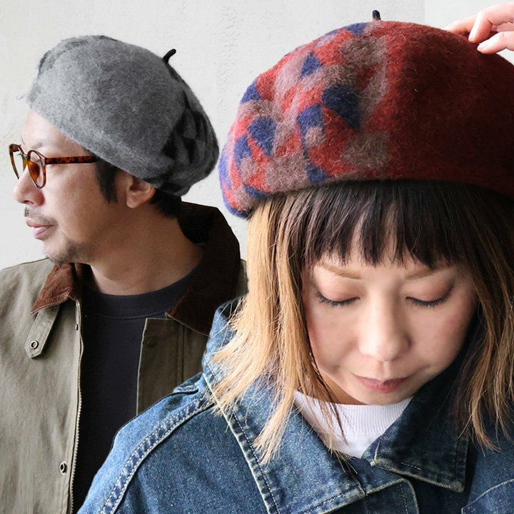アートのような「遊び心」を。 ベレー帽 帽子 ベレー帽 幾何学柄 ウール フェルト 暖かい 軽い チョボ付き カジュアル 秋 冬 メンズ レディース パティ