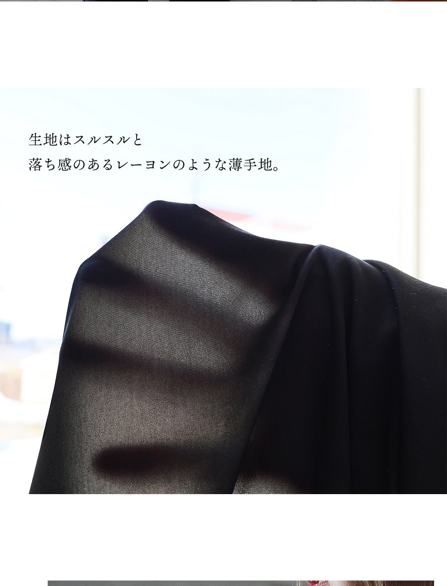 薄軽でスルスルと落ち感があり、表面にやや光沢のあるポリエステル100%地。伸縮性はなく、光にかざすとほんのり透け感があります。