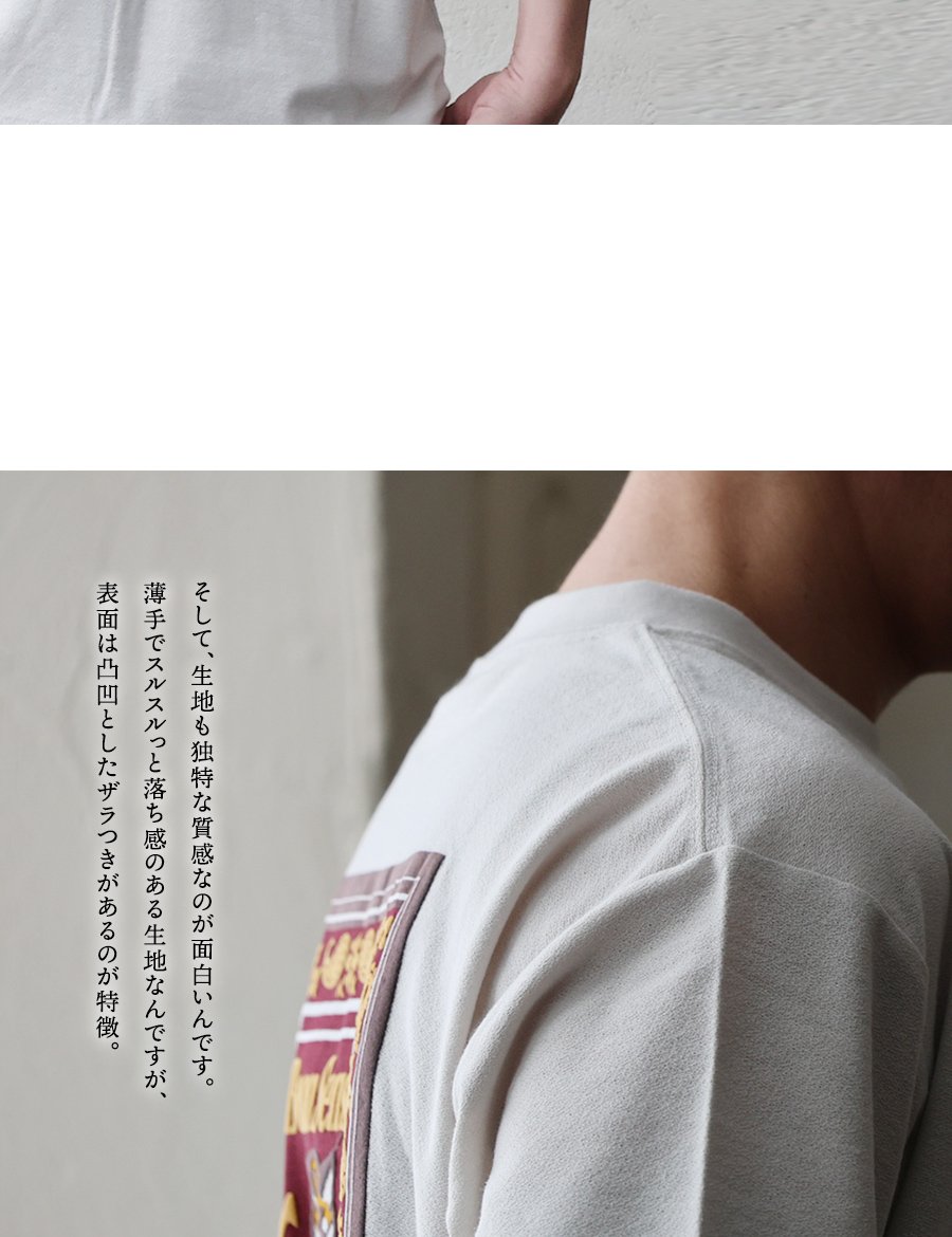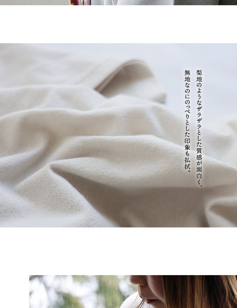薄手で柔らかく、生地表面にザラつきのあるコットン混のポリエステル地。編地による伸縮性がややあり、光にかざすと透け感があります。