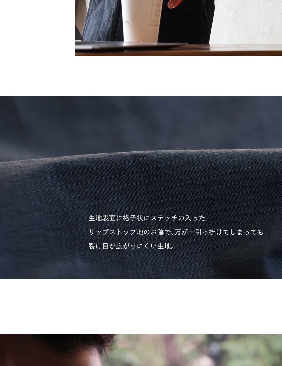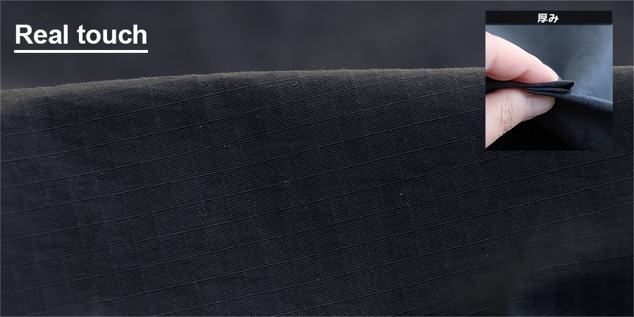 やや薄手でシャカシャカとした質感のナイロン混コットンリップストップ地。伸縮性・透け感はありません。
