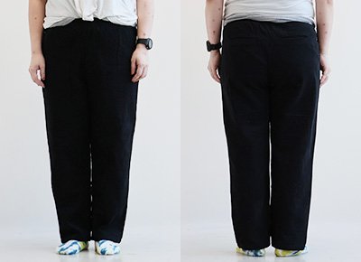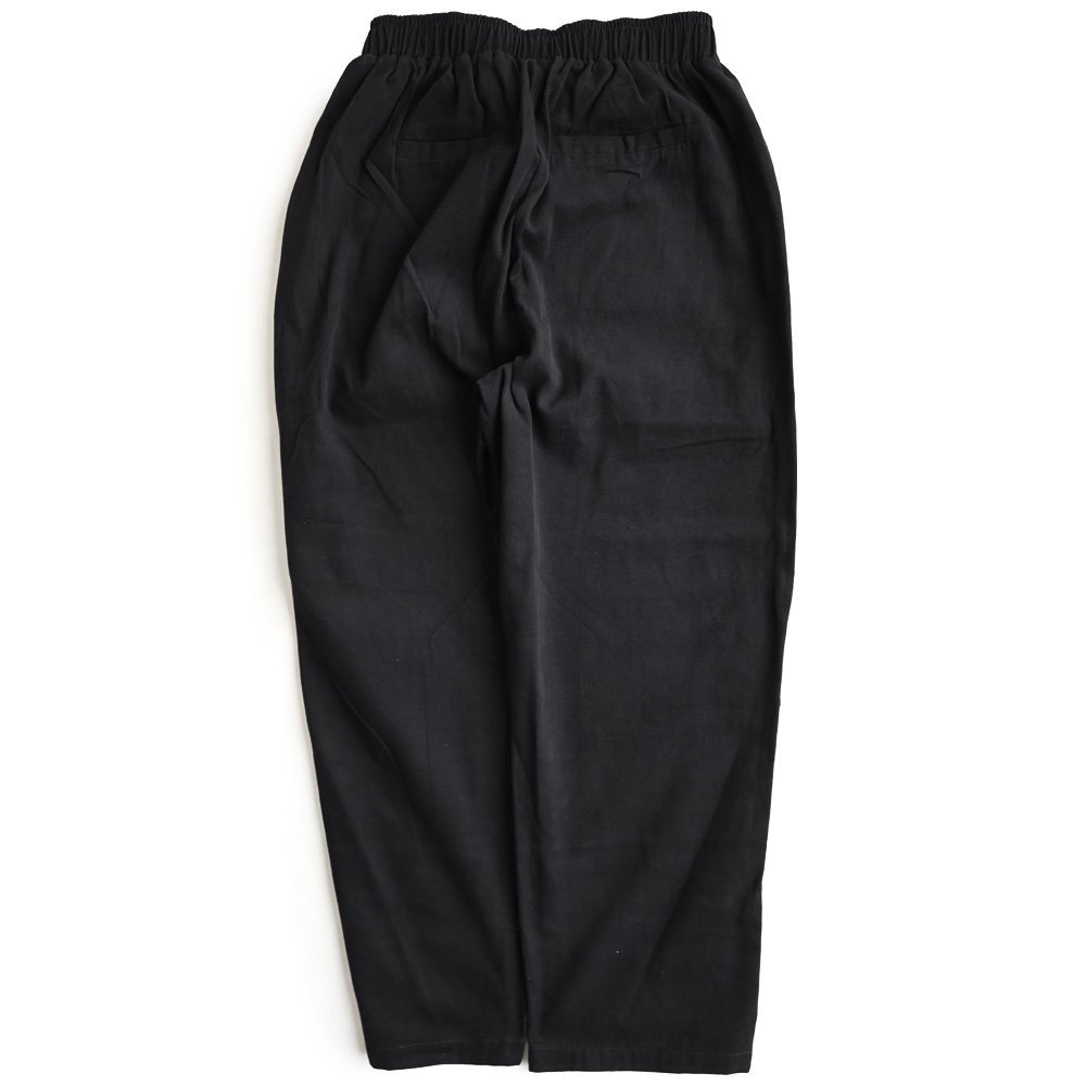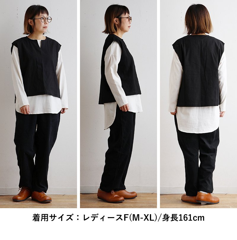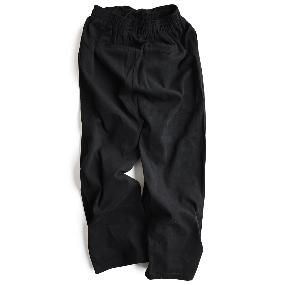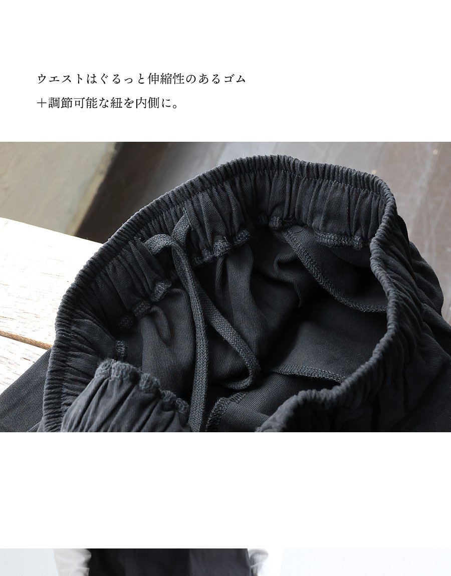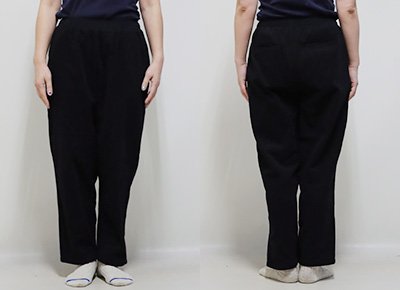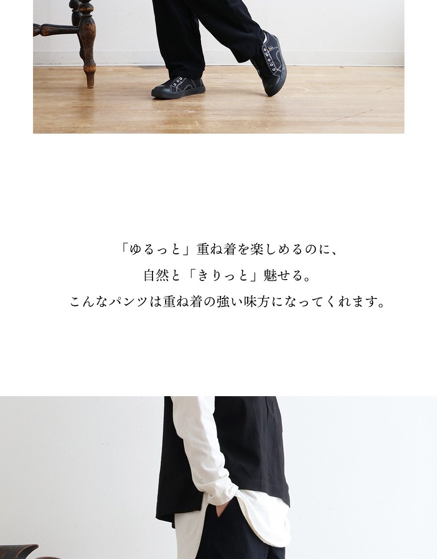 【モデルコメント】ウエストで穿きました。ウエストゴムは適度なフィット感です。中は、スウェットパンツも合わせやすそうなゆとりがありました。 【客観的コメント】かかとに少しかかるくらいの丈の長さです。ゆとりはありながらも、良いシルエットで穿けていましたね。