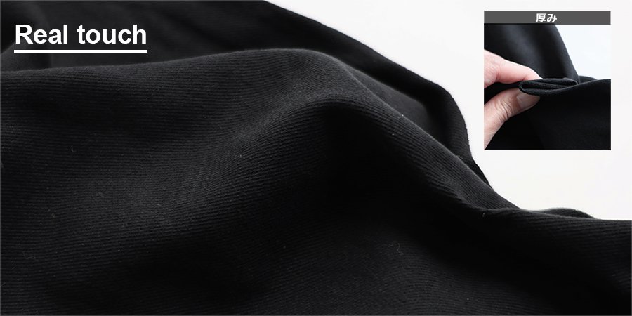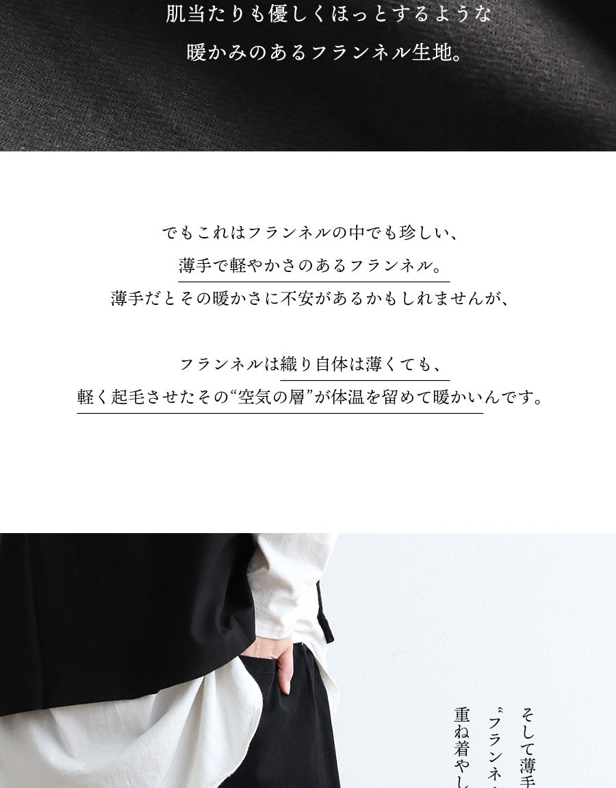 やや薄手ながらも生地密度が高く、ハリ感のあるフランネル地。生地表面が起毛しているのでほわっとした質感でかなり軽やか。伸縮性はなく、透け感はありません。