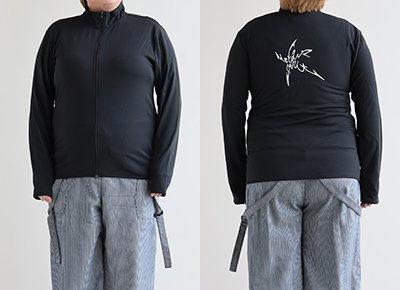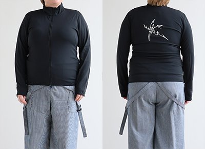 【モデルコメント】中は、タンクトップくらいが良いですね。窮屈感はありませんが、全体的にフィット感の感じるサイジングでした。 【客観的コメント】体のラインは出やすい感じのサイジングだったね。