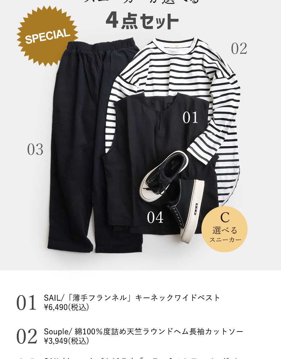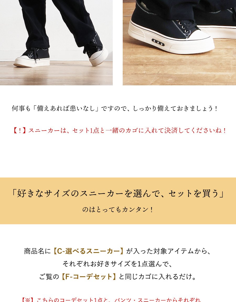 【選べるサイズ】商品ページへ移動し、お好きなサイズを1つ選び、コーデセットと同じカゴでお買い上げください。