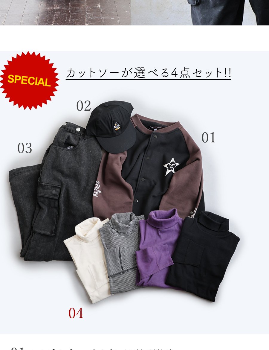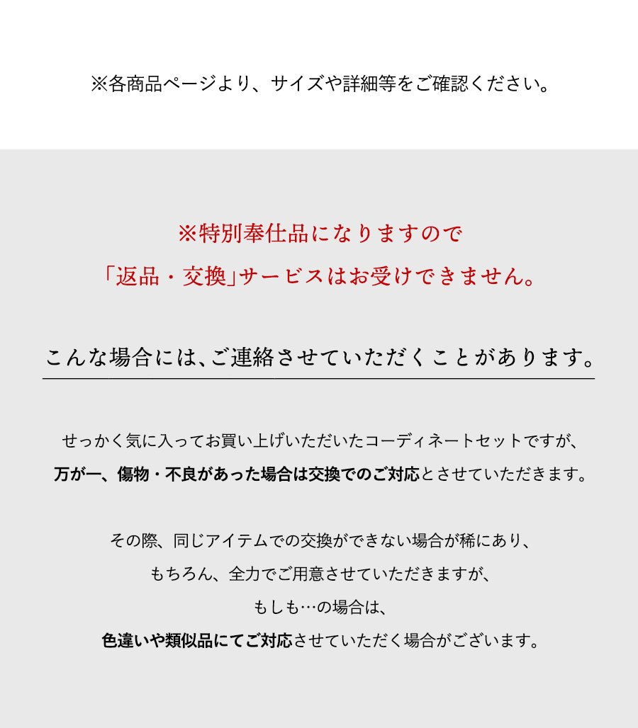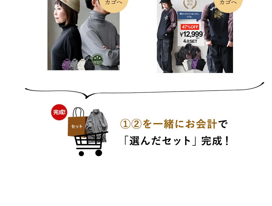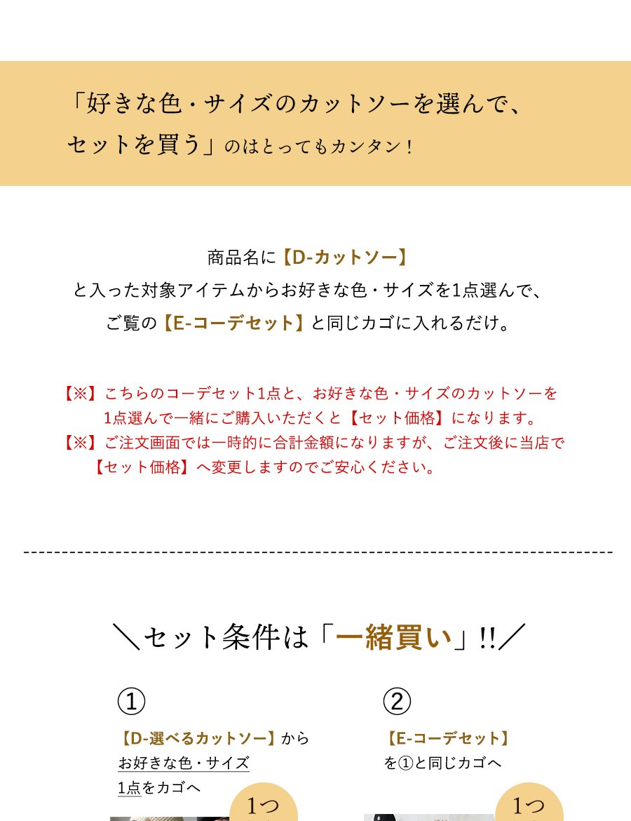 【選べるカラー&サイズ】商品ページへ移動し、お好きな色・サイズを1つ選び、コーデセットと同じカゴでお買い上げください。