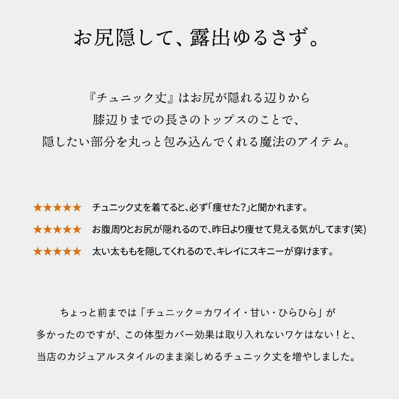 他の画像を見る 「ライン」は見せずに、しっかり「着痩せ」。 着痩せ チュニック tシャツ レディース 五分袖 二の腕 お尻 隠れ カバー ゆったり ワイド スッキリ 切り替え 綿100% コットン しっかり 丈夫 重ね着 ポケット パティ 2~3日でお届け 販売価格 ¥ 5,940 税込 在庫切れ カートに入れる お気に入りに登録する