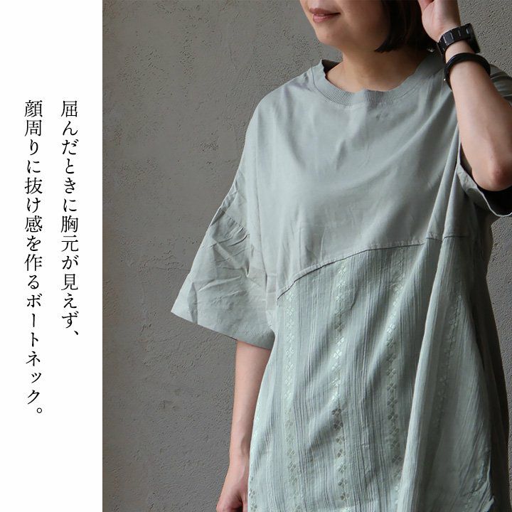 他の画像を見る いつもとは違って、表情を変える「袖」。 【メール便50】 Tシャツ 5分袖 レディース クルーネック 袖切り替え レース 布帛 綿100 コットン 天竺 無地 通気性 ワンポイント ピスネーム 大きいサイズ 体型カバー カジュアル 夏 パティ KAKELA&TRANQUIL カケラ&トランクイル 2~3日でお届け 販売価格 ¥ 5,390 税込 在庫切れ カートに入れる お気に入りに登録する