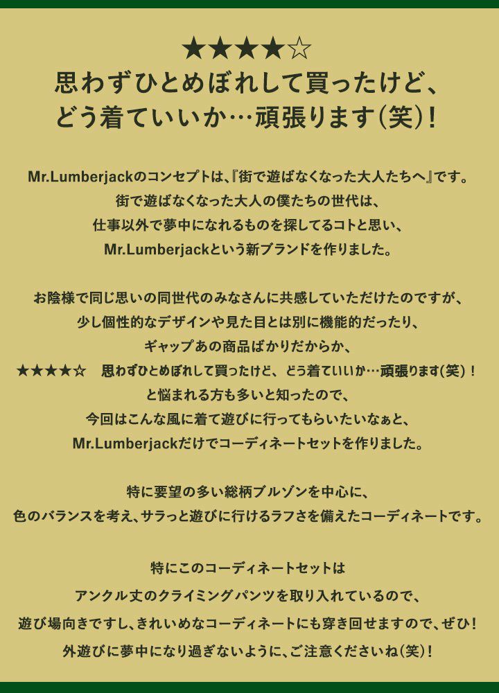 他の画像を見る Mr.Lumberjack「アンクルパンツ」コーディネートセット。 (ミスターランバージャック) Mr.Lumberjack コーデセット 福袋 アウトドア 「TOneontoNE バッグ が 無料」 販売価格 ¥ 16,324 税込 在庫切れ カートに入れる お気に入りに登録する