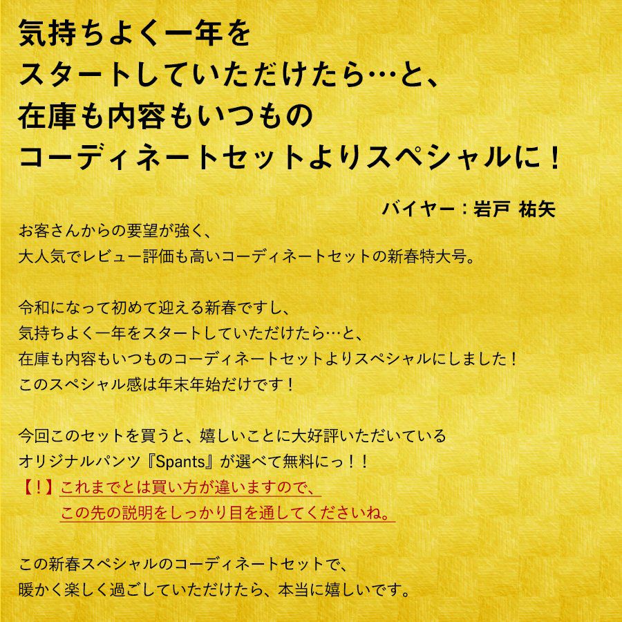 他の画像を見る 欲しかったのは、こんな『納得感』。 セット 福袋 新春 スペシャル SPECIAL 『新作 オリジナル 暖か ニット』 & 『選べる spants パンツ』 が入る 4点 セット 販売価格 ¥ 9,999 税込 在庫切れ 詳細を見る お気に入りに登録する