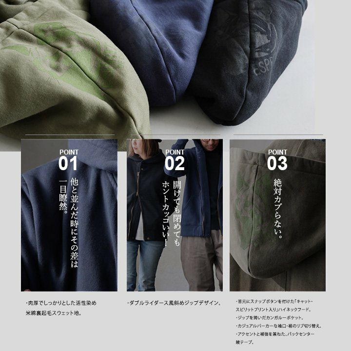 他の画像を見る 楽ちんなスウェットなのに、開けても閉めてもカッコいい。 ライダース パーカー メンズ レディース スウェット 暖かい 裏起毛 しっかり 丈夫 USA コットン 綿100% 長袖 かっこいい 活性染め ジップアップ アメカジ バイカー ダブルジップ リブ ネコ プリント スエット パティ OAR’S オールズ 2~3日でお届け 販売価格 ¥ 10,890 税込 カートに入れる お気に入りに登録する