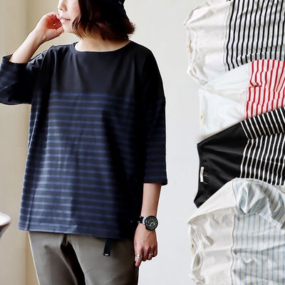 【メール便50】 着痩せ カットソー パネルボーダー ボートネック ワイド 七分袖 7分袖 レディース プルオーバー 重ね着 軽い しっかり 丈夫 コットン ストレッチ すっきり 二の腕 カバー 大人 カジュアル パティ Souple スプルのレビュー