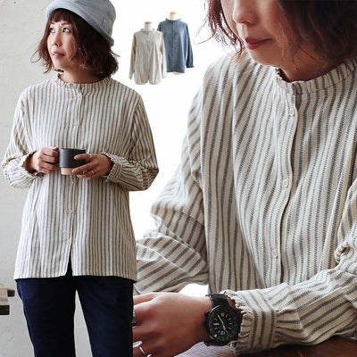ブラウス 長袖 シャツ レディース 前開き ノーカラー ストライプ フリル コットン ポリエステル 伸縮性 ゆったり 体型カバー すっきり 大人カジュアル PATY パティのレビュー