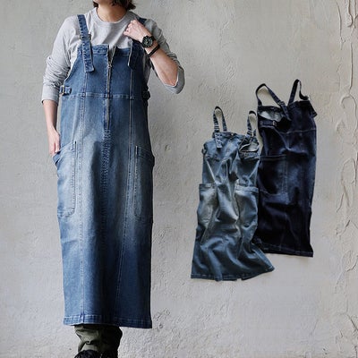 デニム サロペット スカート ジャンスカ ジャンパー マキシ丈 レディース 綿100 コットン スーパーストレッチ 伸びる しっかり 丈夫 大きいポケット スリット ゆったり 体型カバー 大きいサイズ カジュアル メンズライク パティ BLUETO ブルートのレビュー