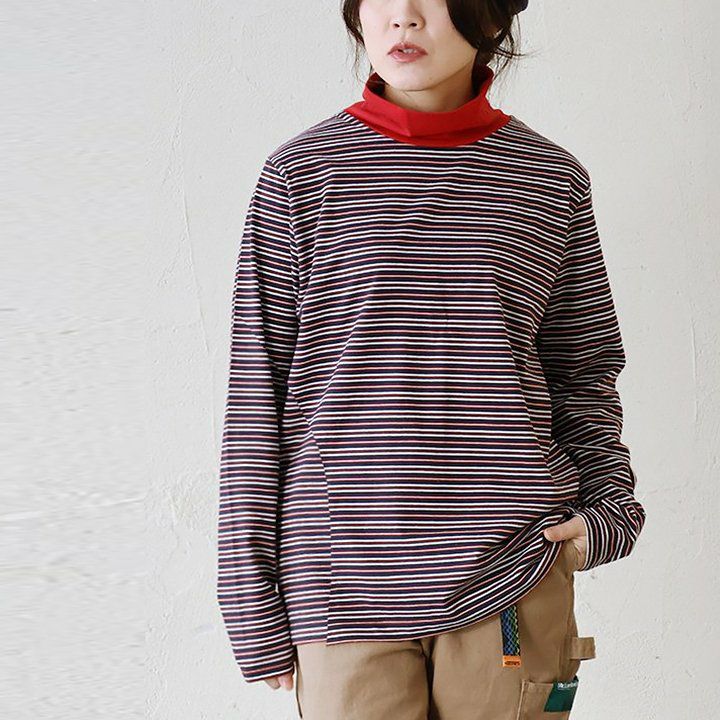 肌触りが良く、インナーとしても、これ1枚でも良い感じです。思っていたよりも身幅があるような気がしますが、柔らかいのと首部分の配色の切り替えですっきり見えますね。色違いで購入して正解でした。 -