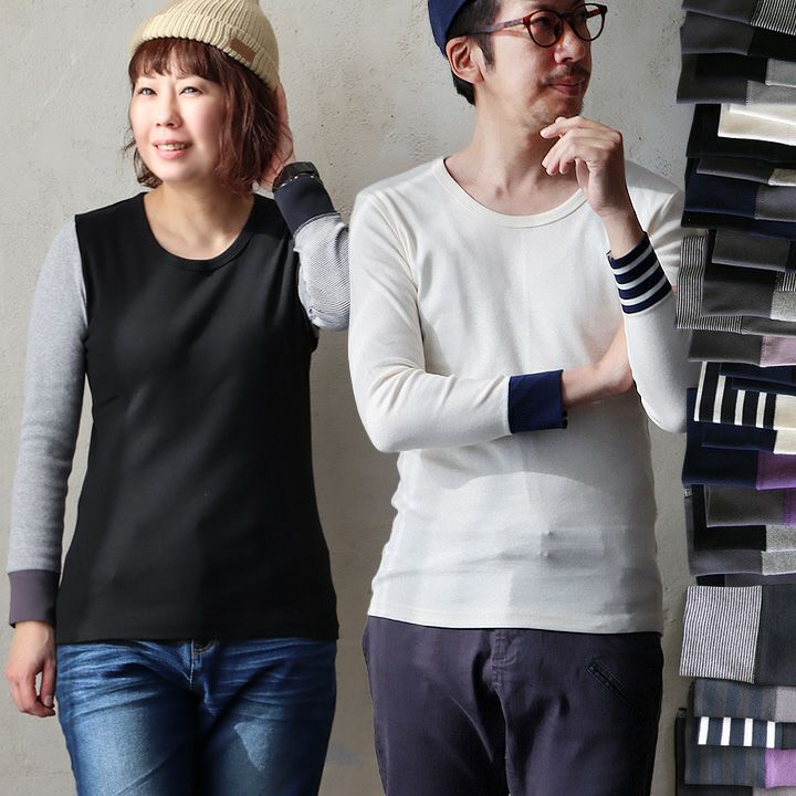 【メール便50】 カットソー 長袖 9分袖 ロングtシャツ 重ね着 すっきり フィット 着痩せ しっかり 丈夫 ストレッチ 柔らかい レディース メンズ 綿100% コットン ロンT インナー トップス tシャツ ロング丈 クレイジー 配色 リブ トップス 洗濯に強い パティ PATY パティ