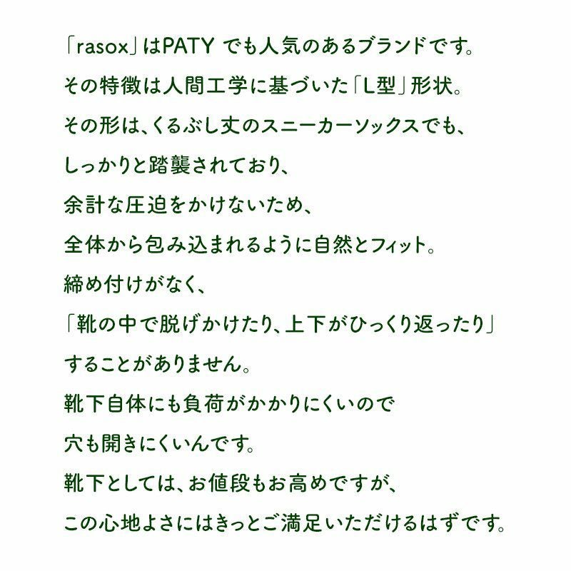 他の画像を見る 脱げない、丸まらないカバーソックス。 ラソックス(rasox) 靴下 ソックス フットカバー 日本製 浅履き 脱げにくい ゴム ストッパー (ラソックス) 40代 50代 販売価格 ¥ 1,430 税込 在庫切れ 詳細を見る お気に入りに登録する