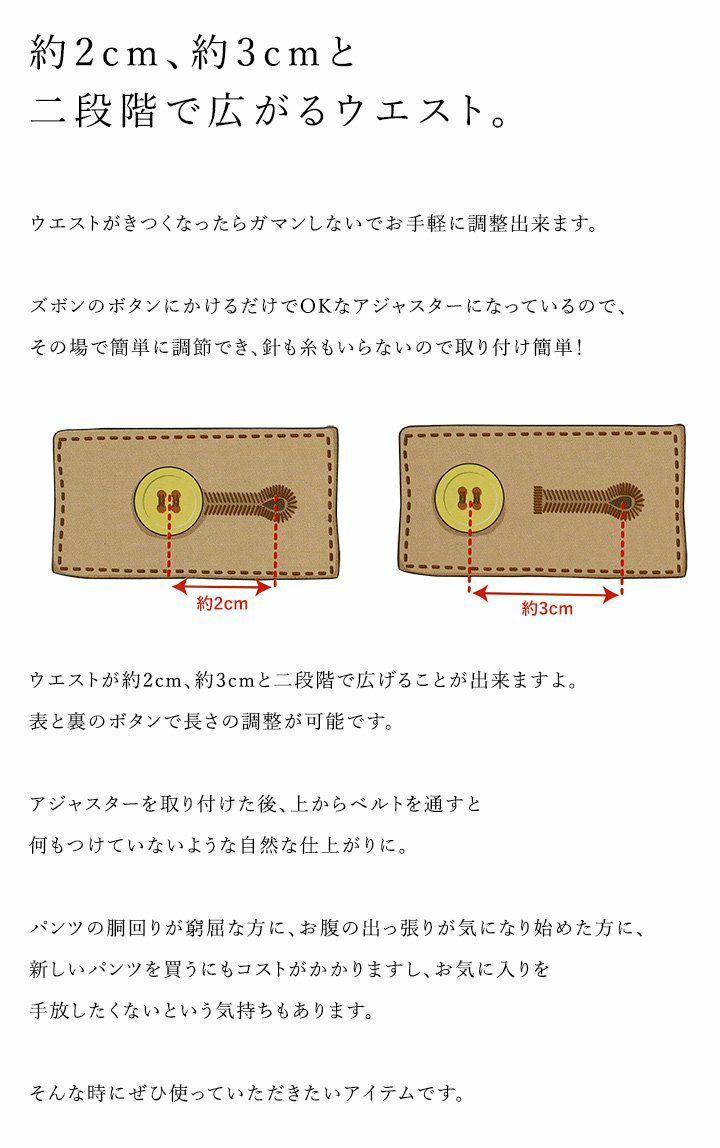 他の画像を見る ウエストがきつくなったら、ガマンしないで。 サイズアジャスター Size Adjuster ボトム ウエスト調節 ウエスト調整 お直し不要 約2cm 約3cm 二段階調整 【メール便05】[メール便05] 2~3日でお届け 販売価格 ¥ 1,320 税込 在庫切れ カートに入れる お気に入りに登録する