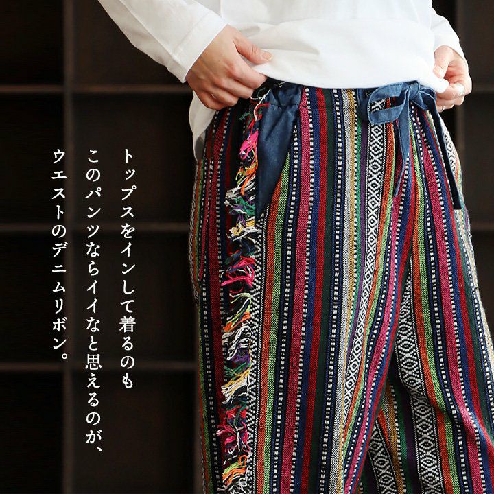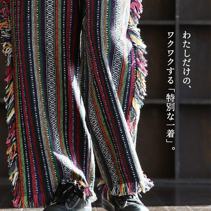 他の画像を見る わたしだけの、ワクワクする「特別な一着」。 パンツ ワイドパンツ ストレート レディース ジャガード ストライプ 民族調 フリンジ デニムリボン ポリエステル コットン 裏地付き ウエストゴム ゆったり 大きいサイズ 体型カバー カジュアル パティ TOBILA トビラ 2~3日でお届け 販売価格 ¥ 14,300 税込 詳細を見る お気に入りに登録する