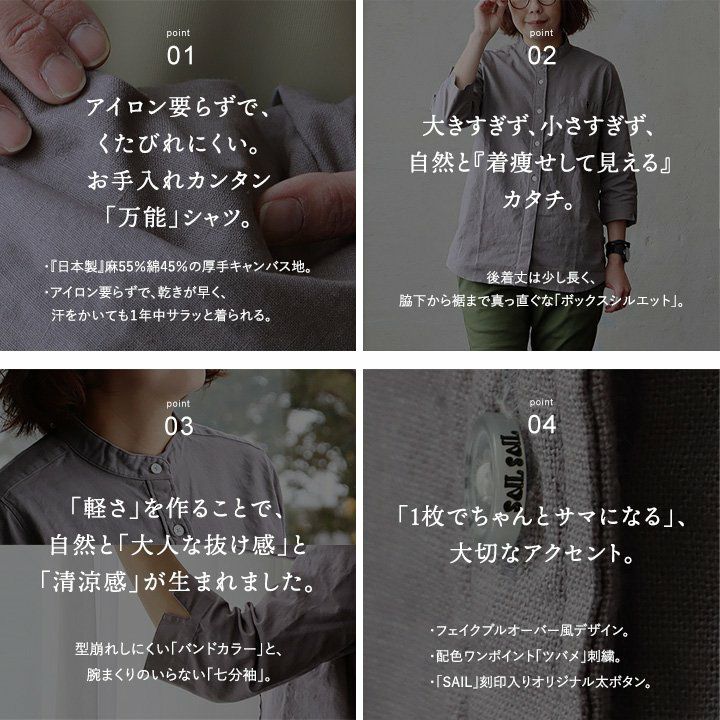 他の画像を見る 着るだけで、「こなし上手」。アイロン要らずの「着痩せ」シャツ。 シャツ 七分袖 日本製 レディース バンドカラー しっかり 丈夫 綿麻 リネン コットン 春 夏 秋 冬 しわになりにくい ノーアイロン すっきり シルエット シンプル 刺繍 パティ SAIL セイル 2~3日でお届け 販売価格 ¥ 9,350 税込 カートに入れる お気に入りに登録する