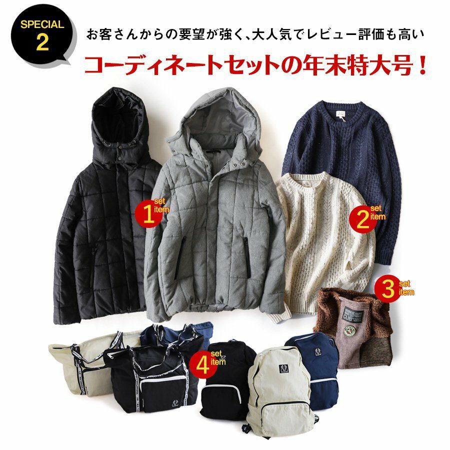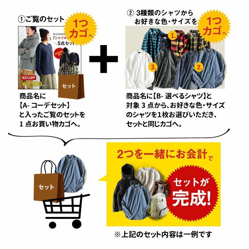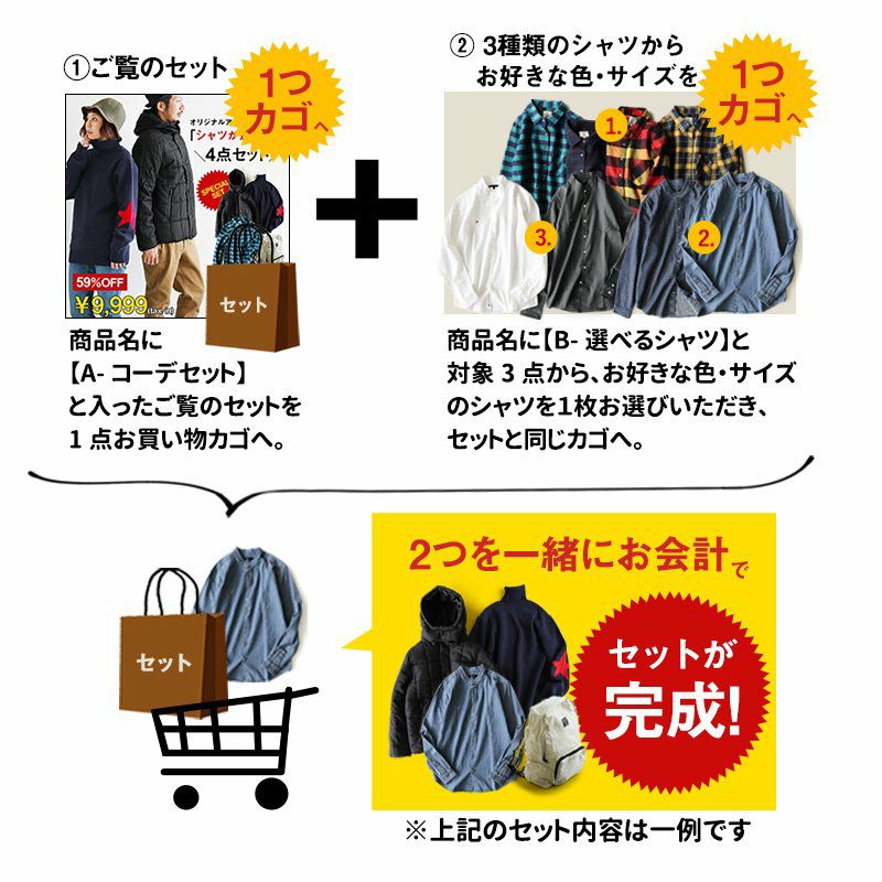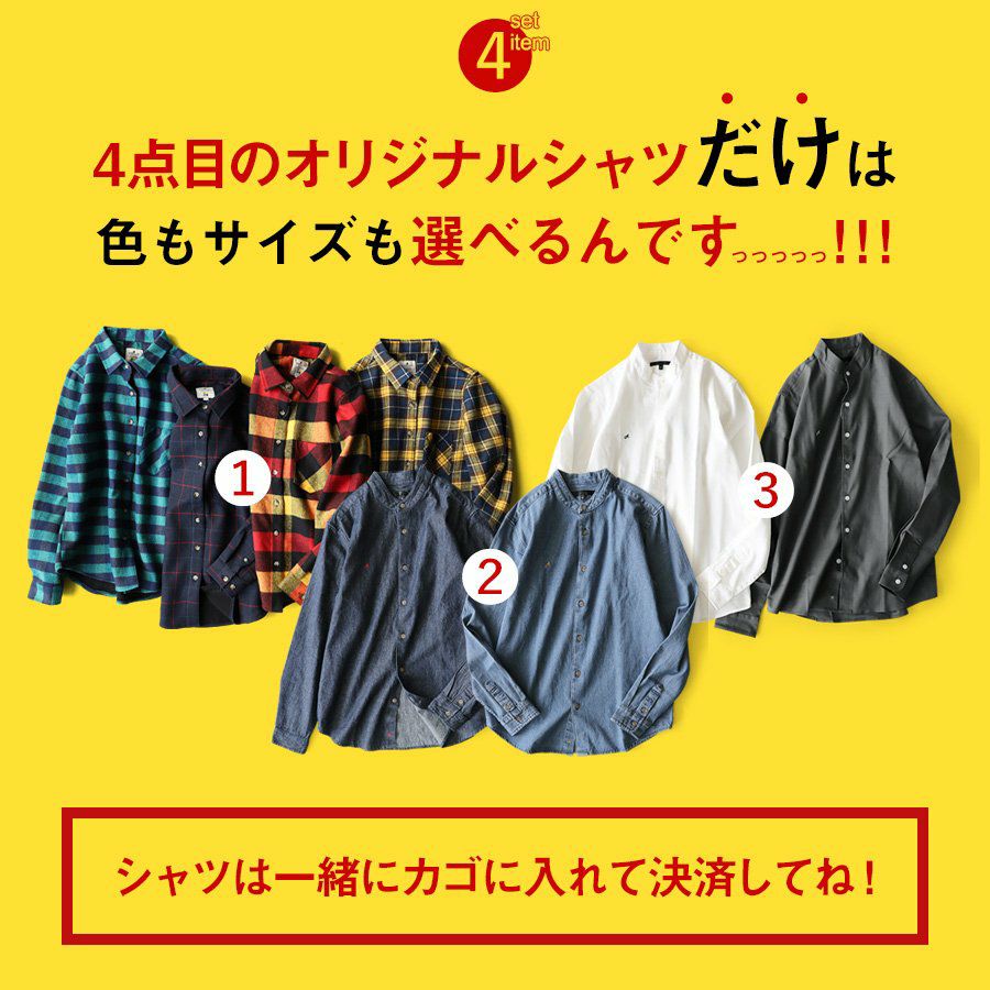 他の画像を見る コーディネートセット年末特大版。 セット 福袋 『新作 オリジナル 暖か アウター』 & 『選べる オリジナル シャツ』 が入る 4点 セット(A-コーデセット) 販売価格 ¥ 9,999 税込 在庫切れ カートに入れる お気に入りに登録する