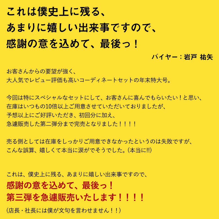 他の画像を見る 欲しかったのは、こんな『納得感』。 セット 福袋 新春 スペシャル SPECIAL 『新作 オリジナル 暖か ニット』 & 『選べる spants パンツ』 が入る 4点 セット 販売価格 ¥ 9,999 税込 在庫切れ 詳細を見る お気に入りに登録する