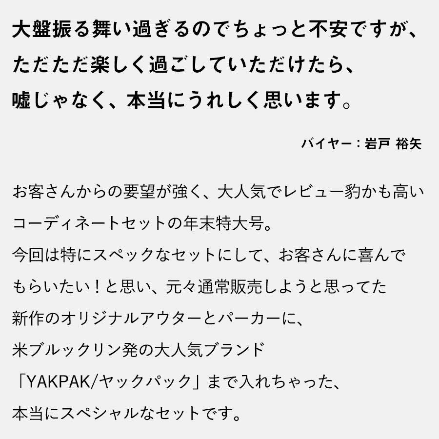 他の画像を見る 冬に、あえての「真っ白」。 コーディネート セット コーデセット 福袋 『レディース カジュアル セット』 お試し 販売価格 ¥ 33,000 税込 在庫切れ カートに入れる お気に入りに登録する
