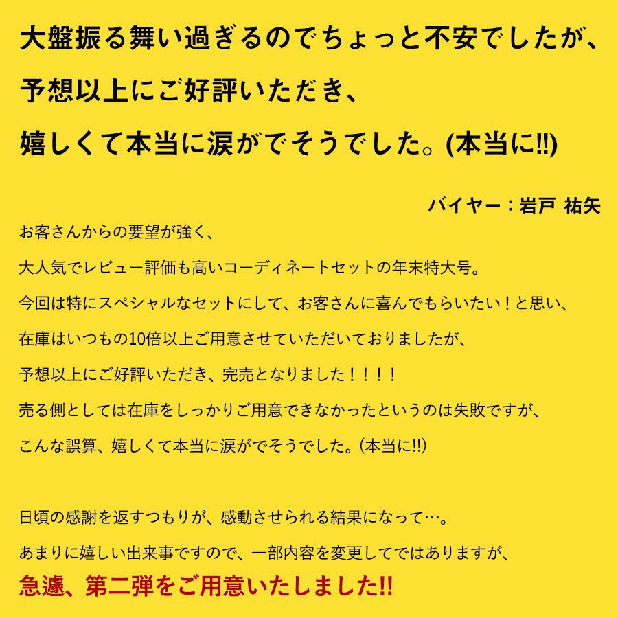 他の画像を見る 大好きなライブを楽しみに、日々頑張る皆さんへ。 コーディネート セット コーデセット 福袋 『レディース カジュアル セット』 お試し 販売価格 ¥ 19,800 税込 在庫切れ カートに入れる お気に入りに登録する