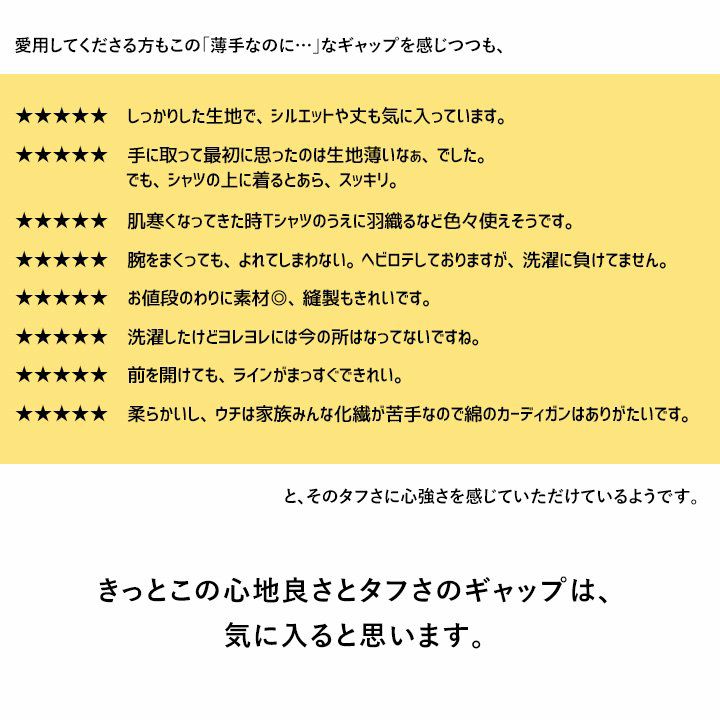 他の画像を見る ヨレずに長持ちする、「重ね着上手なカーディガン」!? (セイル) SAIL 【半端袖】七分袖 カーディガン カーデ リブ Vネック USAコットン 綿100% 販売価格 ¥ 4,950 税込 在庫切れ カートに入れる お気に入りに登録する