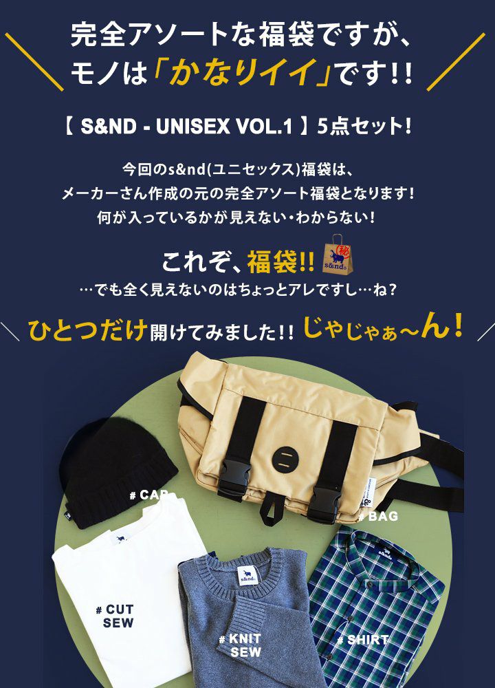 他の画像を見る 【s&nd VOL.2】 2018福袋 ユニセックス (セカンド) s&nd 福袋 2018 メンズ レディース ユニセックス 新 【 s&nd - UNISEX VOL.2 】 数量限定 ブランド 2018福袋 2018新 2018年 お正月 販売価格 ¥ 9,900 税込 在庫切れ 詳細を見る お気に入りに登録する
