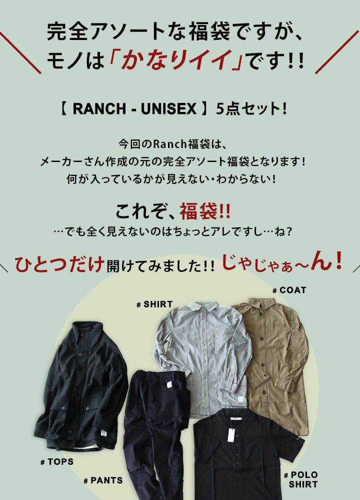 他の画像を見る Ranch 2018福袋 ユニセックス 福袋 2018 レディース メンズ ユニセックス 新 【 Ranch ランチ 】 数量限定 ブランド 2018福袋 2018新 販売価格 ¥ 18,700 税込 在庫切れ 詳細を見る お気に入りに登録する