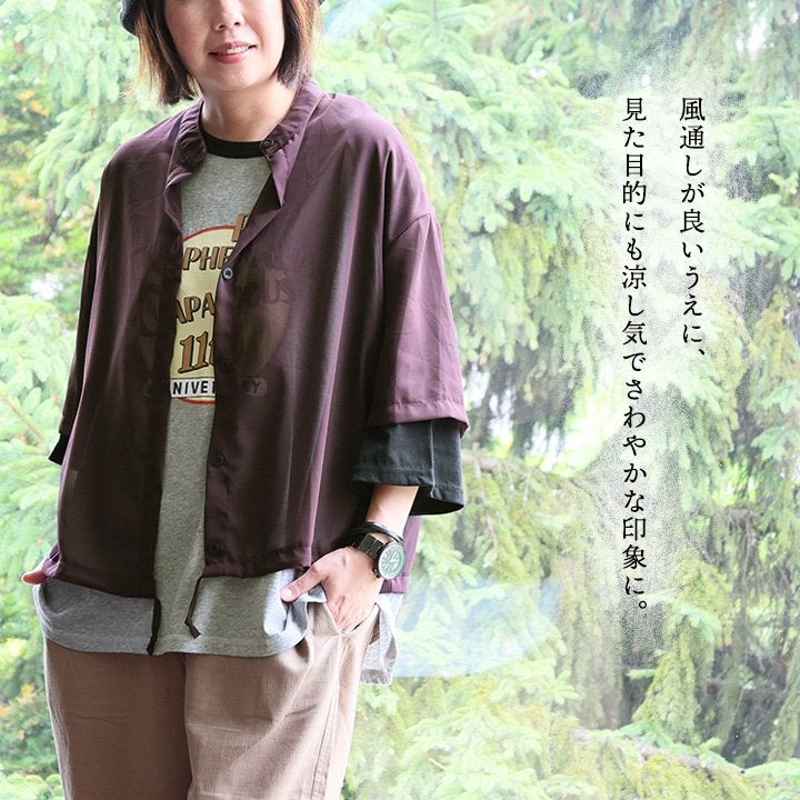 他の画像を見る 肩の力のを抜いて着られる、ラフで涼しいシアーシャツ。 シャツ 5分袖 レディース バンドカラー シアー 無地 透け感 薄手 涼しい ポリエステル 重ね着 ゆったり 大きいサイズ 体型カバー カジュアル 夏 パティ GENTIL ジャンティ 2~3日でお届け 販売価格 ¥ 4,290 税込 カートに入れる お気に入りに登録する