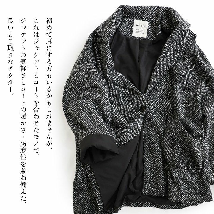 他の画像を見る ジャケットとコートの「良いとこ取り」アウター。 ジャコット ジャケット コート レディース 長袖 Vネック へリンボーン ウールライク モノクロ ポリエステル 裏地付き ダブルフェイス 軽い ゆったり 暖かい 大きいサイズ 体型カバー カジュアル 秋 冬 パティ le colis ルコリ 2~3日でお届け 販売価格 ¥ 8,690 税込 在庫切れ カートに入れる お気に入りに登録する